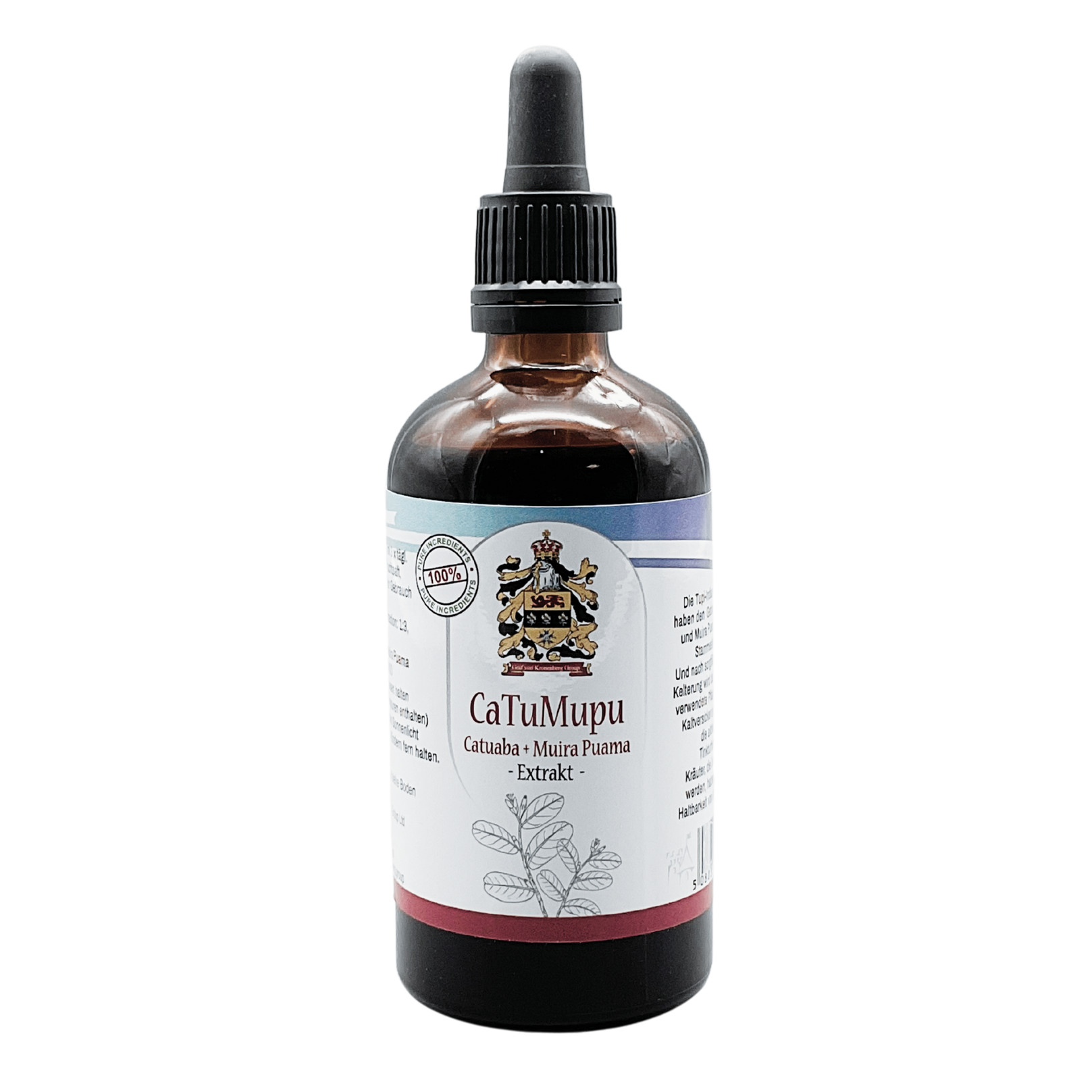 Contenido: 100 ml de Catuaba pura y Muri Puama extracción ultrasónica/25% alcohol/ En frasco de vidrio médico marrón con pipeta.