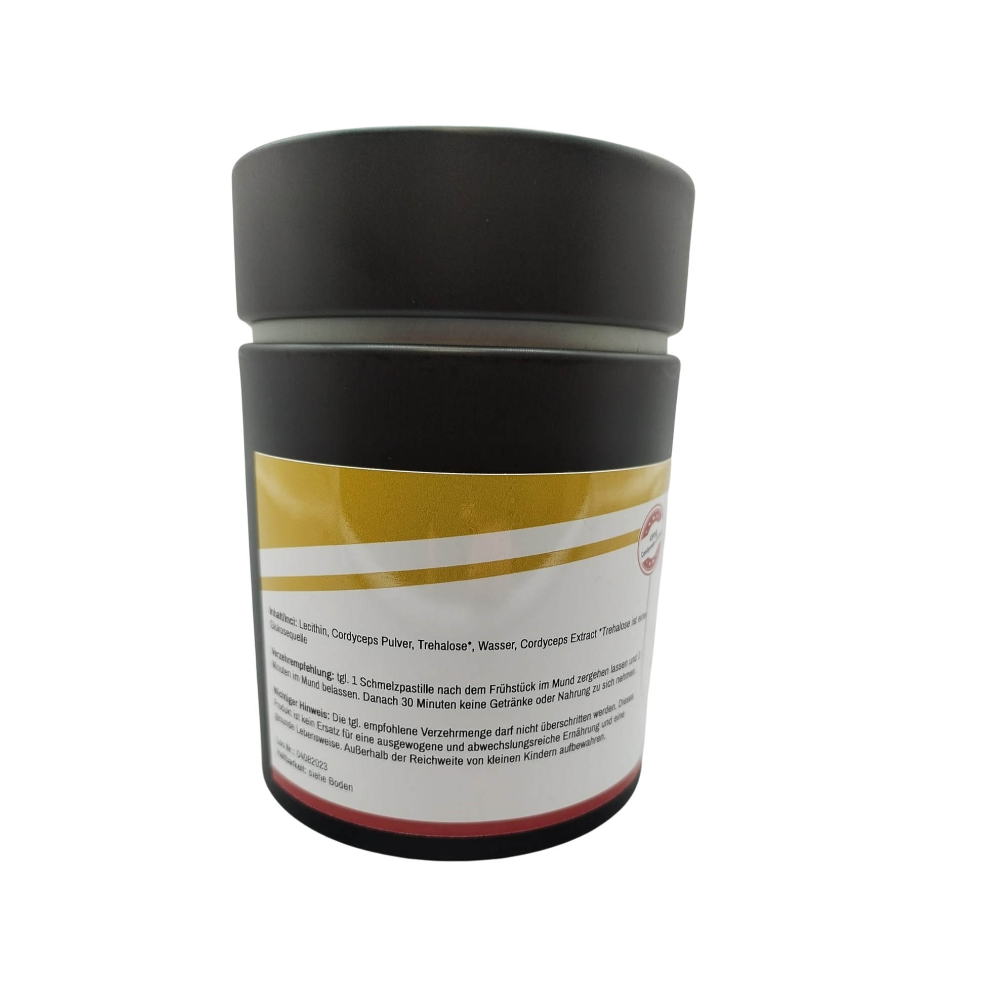 Contenido: 30 pastillas que se disuelven en la boca, cada una con 1,5 mg de ingrediente activo cordicepina, suministro para un mes.