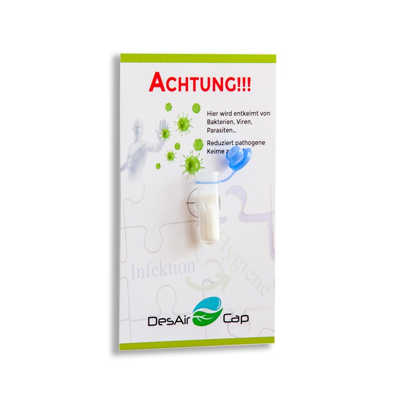 Una cápsula DesAirCap mantiene hasta 80 m³ de aire libre de gérmenes y fresco durante aproximadamente 6 meses. ¡Una solución sostenible para el medio ambiente! La sostenibilidad de DesAirCap también se evidencia en que la cápsula se puede desechar con la basura común después de su uso y es inocua.