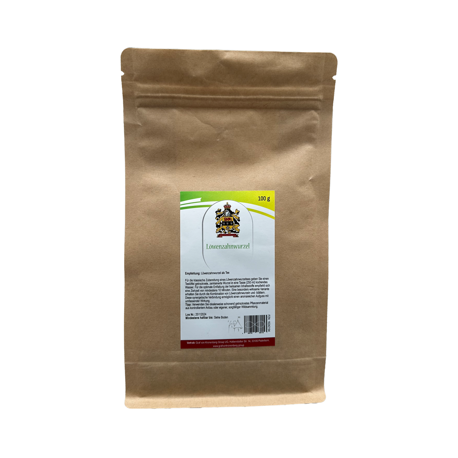 Contenido: 100 g de raíz de diente de león seca en bolsa de papel/calidad ecológica sin etiquetado, porque: Ahorramos costes en beneficio del consumidor.