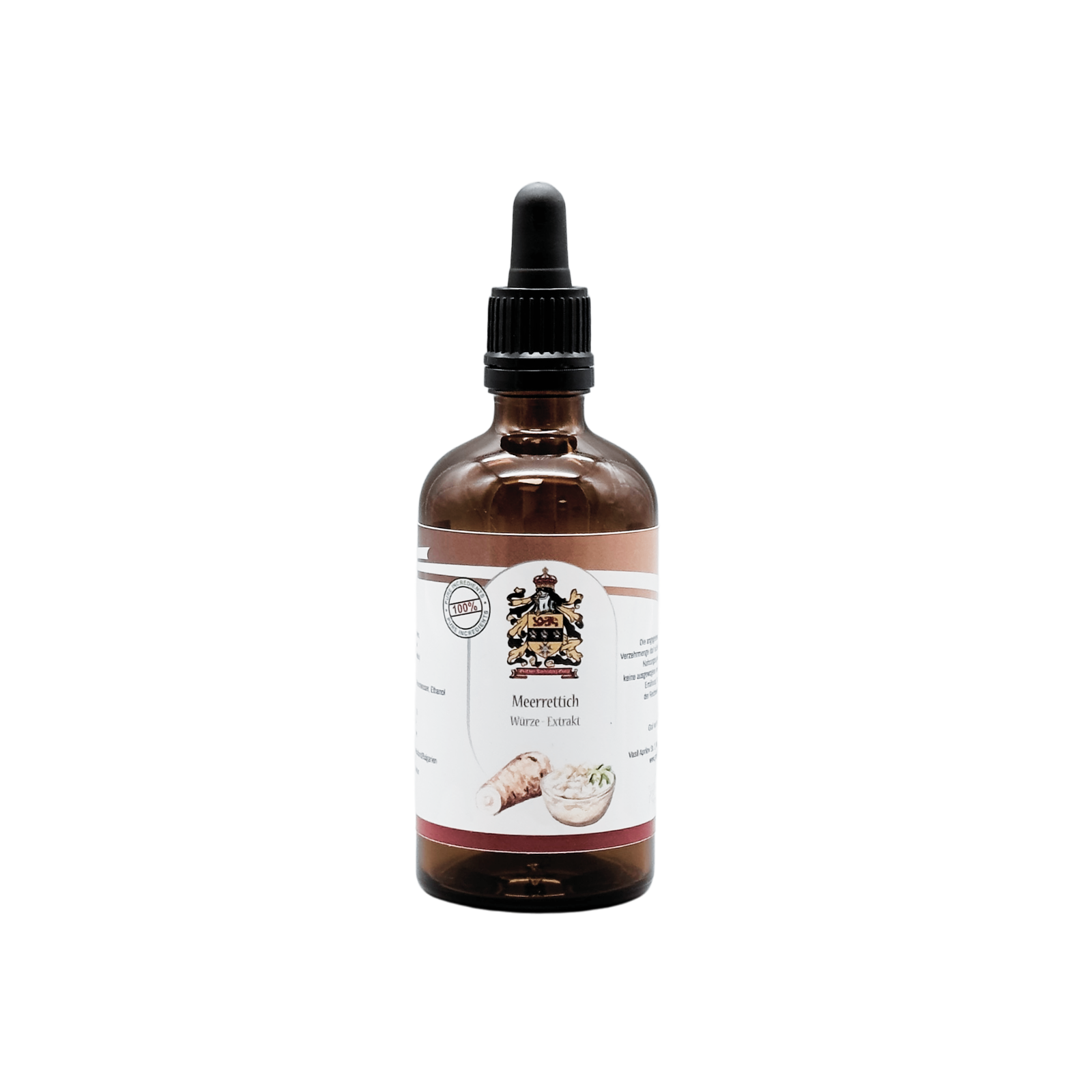 Contenido: 100 ml de extracto de raíz de rábano picante, agua purificada, etanol en una botella de vidrio marrón con pipeta.
