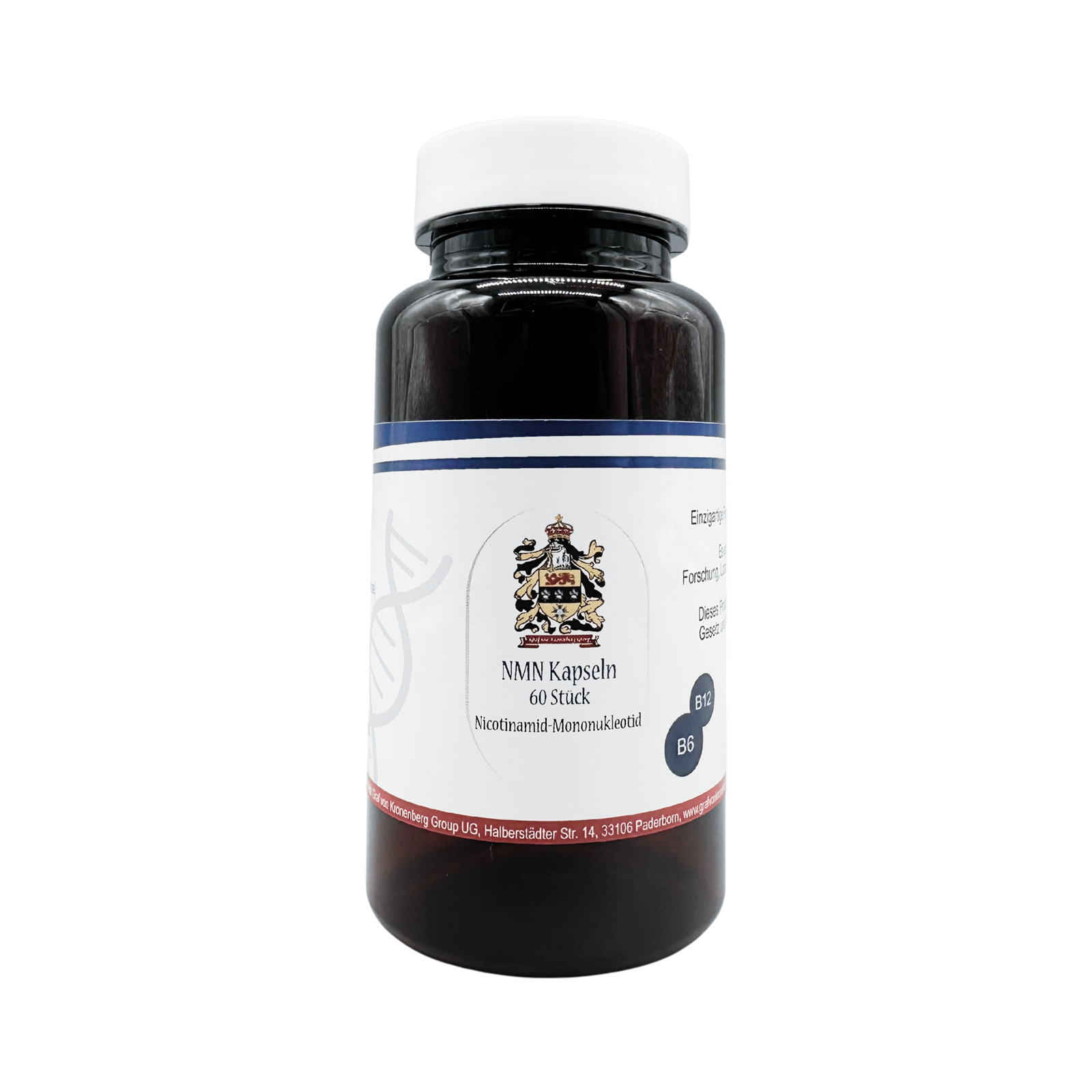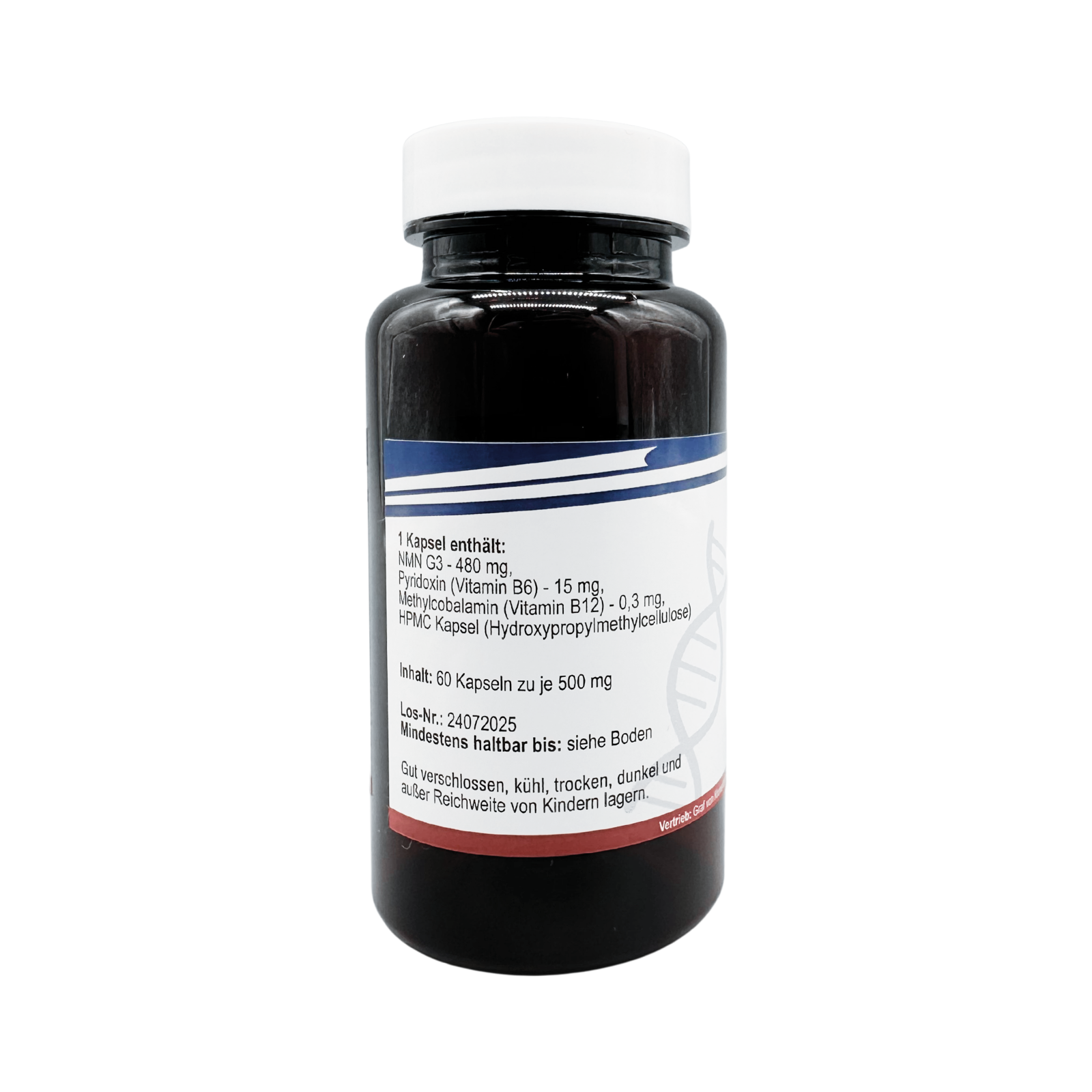 Nuestro producto contiene 60 cápsulas, cada una con 500 mg de NMN, además de vitaminas B6 (piridoxina) y B12 (metilcobalamina). Esta fórmula única combina NMN altamente purificado con estas dos vitaminas bioactivas. Está destinado exclusivamente a investigación científica, pruebas de laboratorio o fines cosméticos.