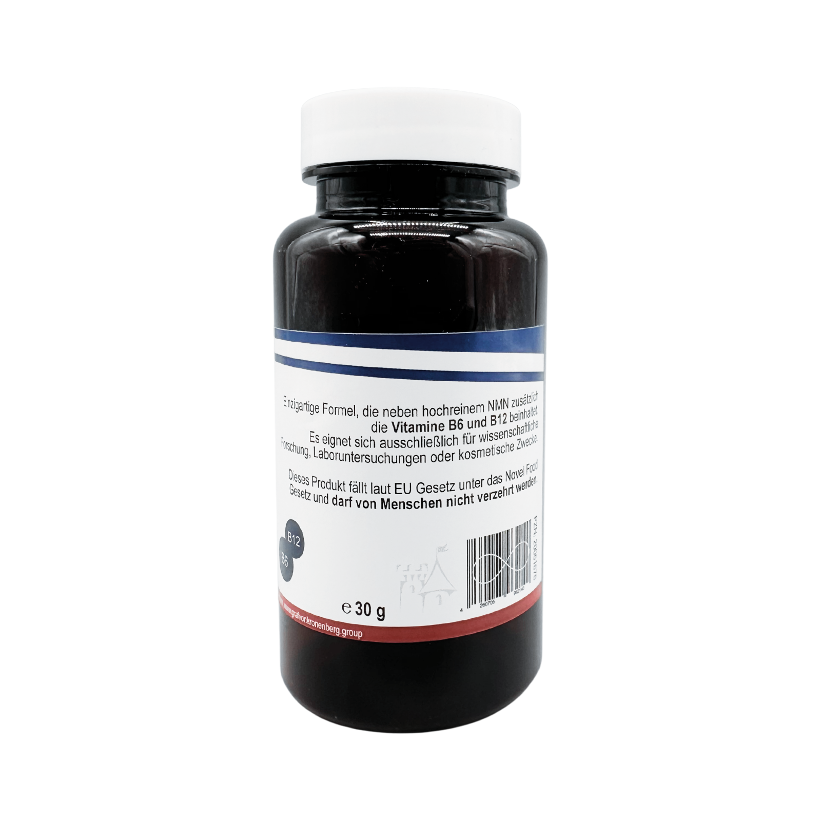 Nuestro producto contiene 60 cápsulas, cada una con 500 mg de NMN , además de vitaminas B6 (piridoxina) y B12 (metilcobalamina) . El Grupo GvK ofrece así una fórmula única que, además de NMN altamente purificado, también incluye estas dos vitaminas bioactivas. Es apto exclusivamente para investigación científica, pruebas de laboratorio o fines cosméticos.