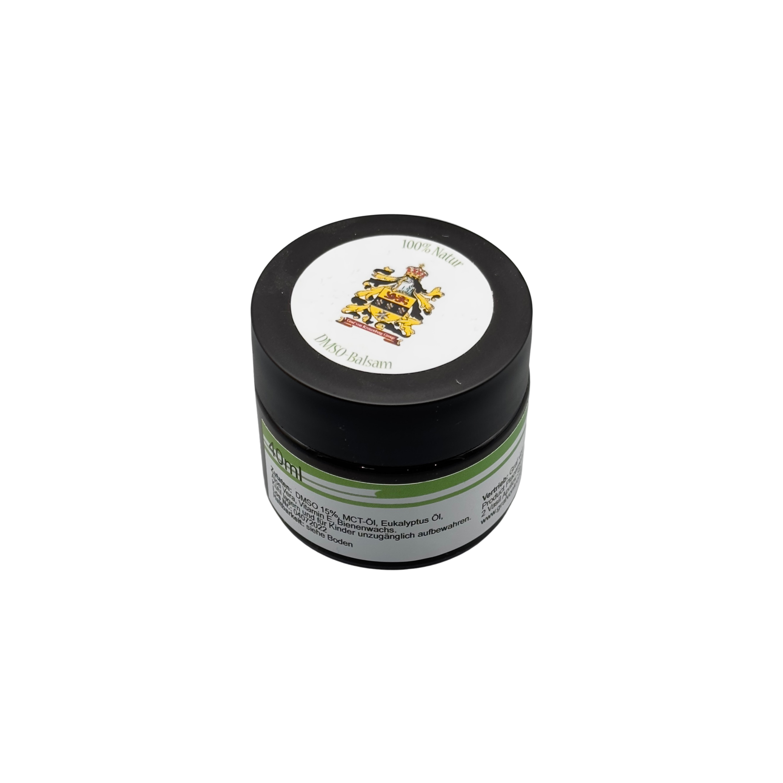 40ml DMSO-Balsam mit DMSO (15 %), MCT-ÖL, Eukalyptusöl, Aloe vera, Vitamin E, Bienenwachs. Entnahme-Spatel liegt bei.