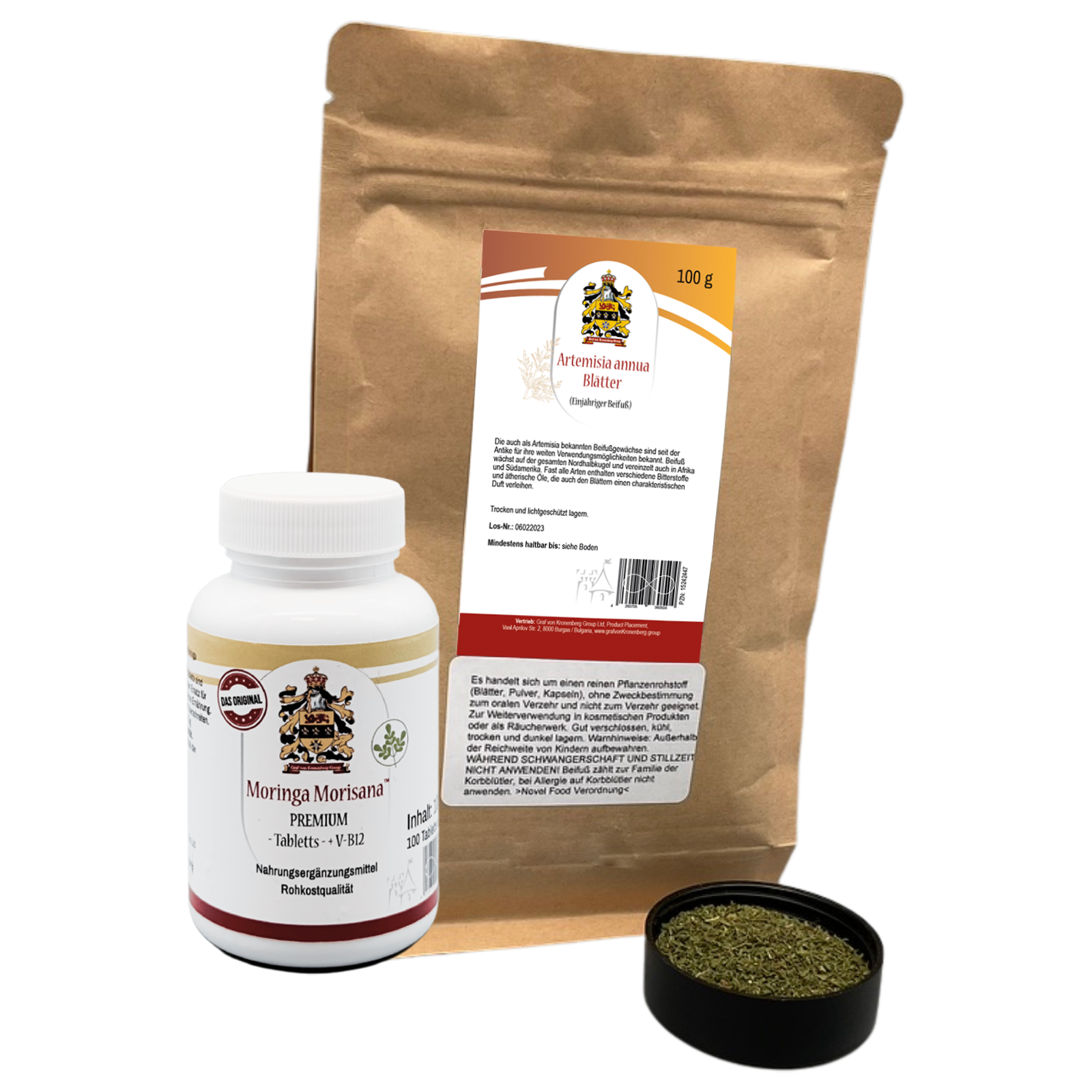 Artemisia Annua Blätter (100 g) plus Moringa Morisana Premium (100 Presslinge) – die Power-Kombination.